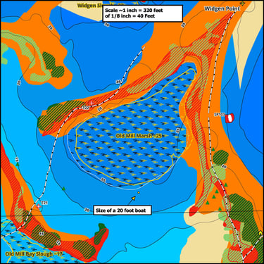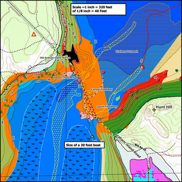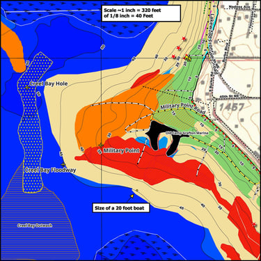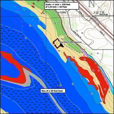 Maps highlight flooded timber, aquatic vegetation, lake bottom types, and manmade structures where fish gather.